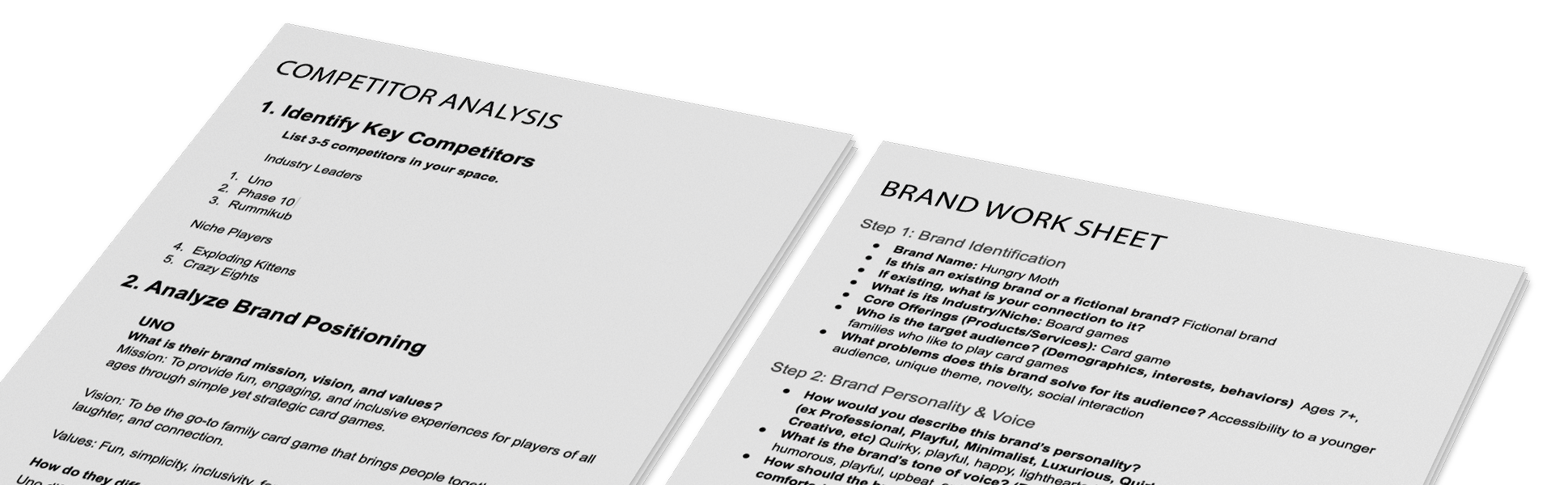 Before launching Hungry Moth, I conducted a detailed competitor analysis to understand how similar indie card games positioned themselves visually, verbally, and strategically. This helped identify gaps and opportunities in the market. I also completed a brand worksheet to define the game’s core values, tone, audience, and key differentiators. This foundational work ensured the brand was clear, consistent, and ready to stand out in a crowded space while staying true to its playful spirit.