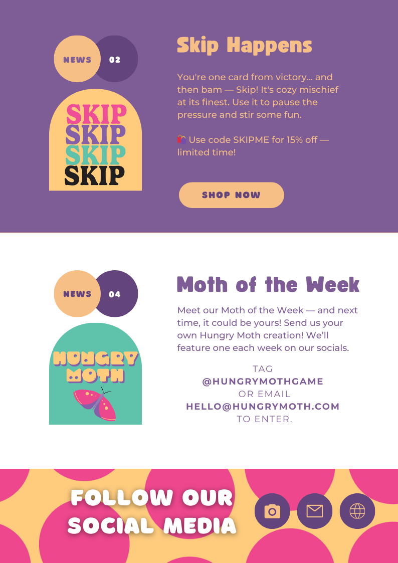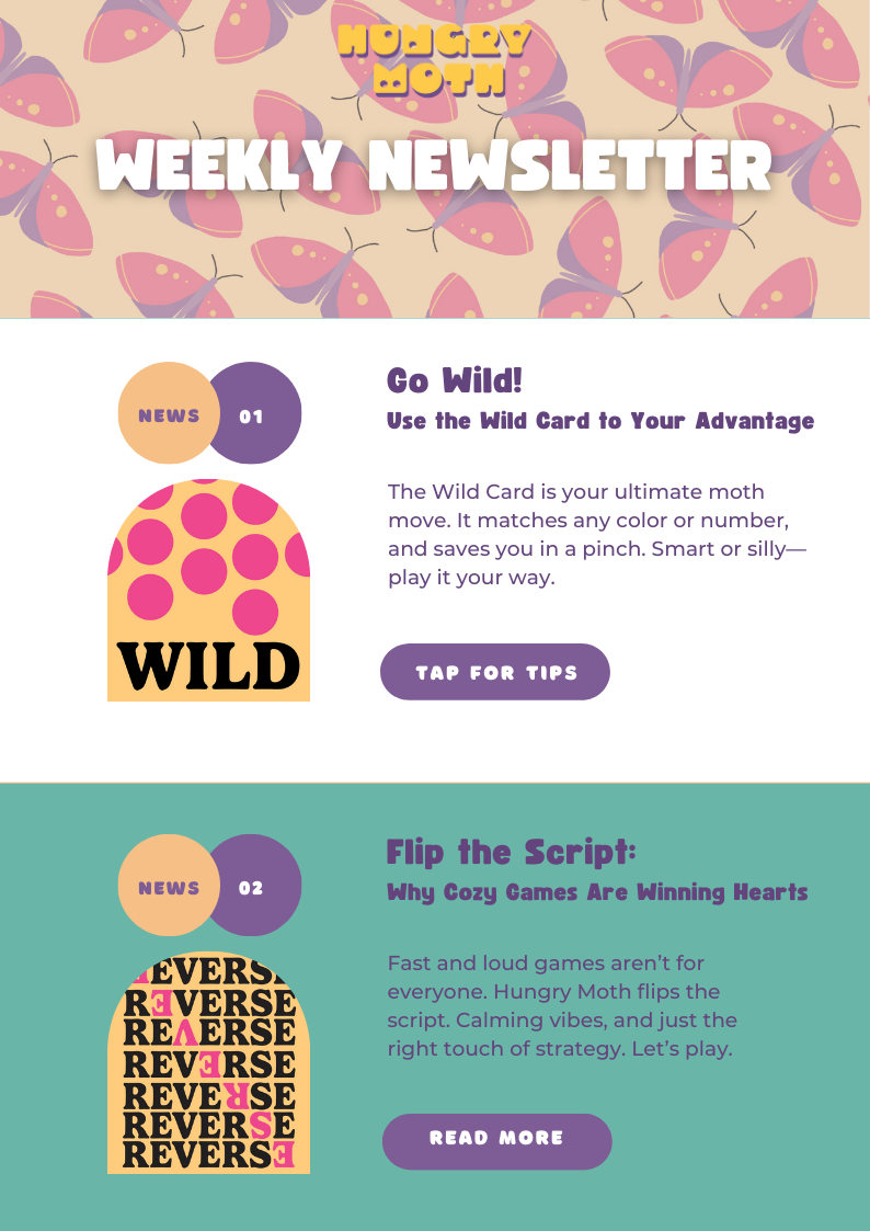 The Hungry Moth newsletter was crafted to engage fans by offering a variety of captivating topics related to the game. It explores gameplay strategies to help players conquer the Moon Phases, shares behind-the-scenes stories about the game’s design and artwork, and highlights special cards like Wild, Skip, and Reverse. Community features showcase fan artwork and stories, while sneak peeks reveal upcoming updates and expansions. This diverse mix of content keeps readers informed, intrigued, and connected to the growing Hungry Moth community.